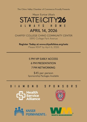 Join us for a memorable evening at the Mayor's 2026 State of the City Address: "Always Home" on April 14, 2026, at the Chaffey College Chino Community Center. Presented by the Chino Valley Chamber of Commerce, this signature event will feature Mayor Eunice Ulloa highlighting the City's major accomplishments and offering a compelling look ahead at the exciting projects and opportunities shaping Chino's future.